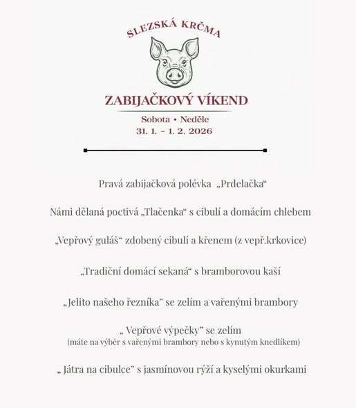 159 KčZabijačkový víkend 31. 1. – 1. 2. 2026 Zveme vás na pravý zabijačkový víkend, kde to voní poctivou domácí kuchyní ❤️ Zjistit více